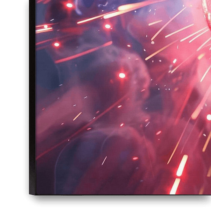 Dieses fröhliche, trendige Kunstwerk zeigt einen Schnappschuss einer leuchtenden Discokugel, die kurz vor dem Ausbruch steht, umgeben von einem Wirbelsturm aus funkelnden Funken und Lichtstrahlen.