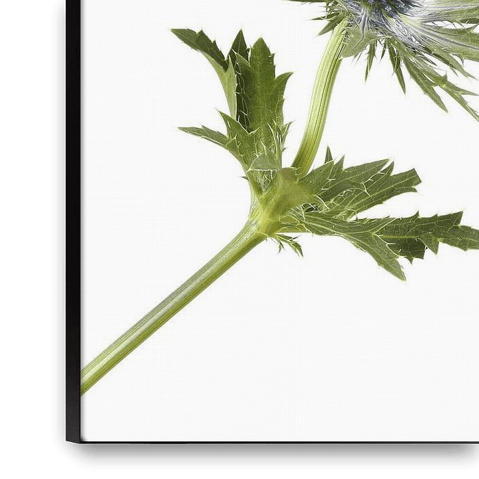 Eine Nahaufnahme von Disteln vor einem weißen Hintergrund. Die Blüten heben sich schön von dem hellen Hintergrund ab.
