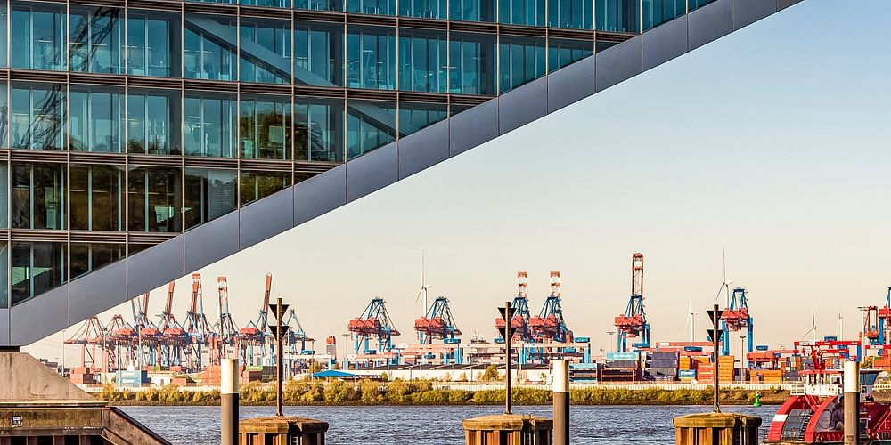 Das Bürogebäude Dockland, entworfen vom Architekturbüro BRT Bothe Richter Teherani, und eine Fähre auf der Elbe im Hamburger Hafen im Stadtteil Altona-Altstadt in Hamburg, Deutschland