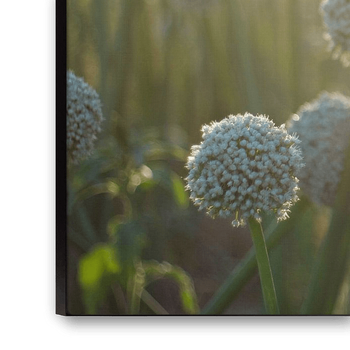 Opkomend zonlicht over een veld met bloeiende uien. Het zachte tegenlicht geeft een uniek sfeertje, en de goede kijker ziet wat spinragdraden met dauw tussen de bollen oplichten.