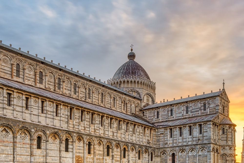 Blick über die Piazza dei Miracoli zum Dom Santa Maria Assunta mit dem Schiefen Glockenturm als einem der Wahrzeichen der Stadt.
