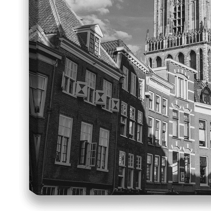Der Utrechter Domturm und die Häuser der Oudegracht an einem sonnigen Tag in schwarz-weiß.