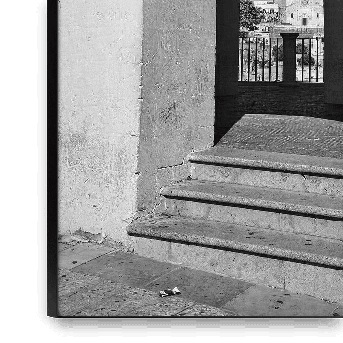 Doppelansicht durch zwei Bögen mit Blick auf den Kirchturm der Sassi di Matera in der Basilikata in Italien in Schwarz-Weiß. Dieses Werk ist Teil der 'La Dolce Vita-Sammlung'.