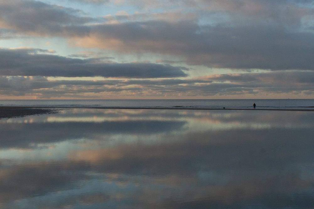 Spiegelung eines spektakulären Sonnenuntergangs am Meer.