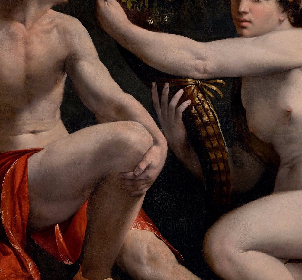 Hier sitzt sie als nackte Frau mit einem Mann ohne Oberteil zusammen. Infolgedessen sind Brust, Arme und Beine beider Personen auf dem Porträt zu sehen. Weitere Leinwände und Attribute in Gold und Rot.