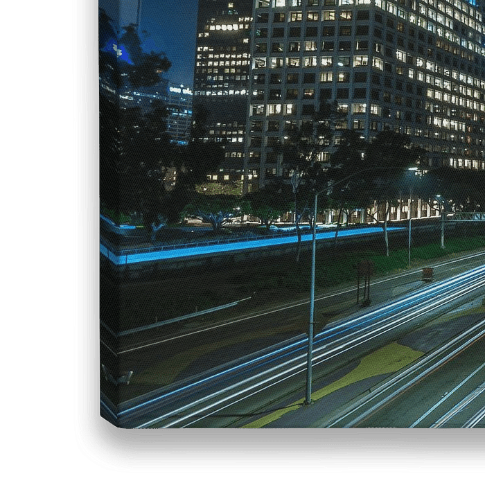 Das Zentrum von Los Angeles ist nachts fast ausgestorben, mit Ausnahme der Autos, die auf der Autobahn fahren, die durch die Stadt führt.