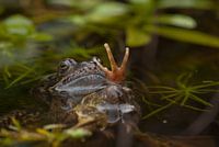 Sich paarende Frösche zwischen den Wasserpflanzen.