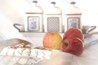Romantischer Landhausstil, Food Design, leuchtende Äpfel mit weichen Kontrasten zum alten Porzellan und Leinen.