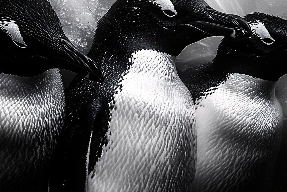 Diese wunderschöne Schwarz-Weiß-Komposition zeigt drei Pinguine in einer eisigen, geheimnisvollen Umgebung. Der Einsatz von Licht und Schatten hebt die Textur ihres Gefieders und den eisigen Hintergrund hervor und schafft ein modernes und stilvolles Kunstwerk. Ideal für Liebhaber der Tierkunst und eine perfekte Ergänzung für eine moderne Einrichtung.