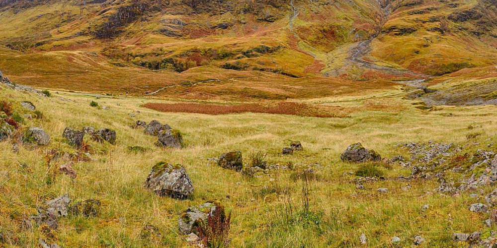 The Three Sisters of Glencoe ist ein charakteristischer Ort für Schottland. Raue, aber nicht extrem hohe Berge, oft bewölkt, aber nicht immer Regen. Dieses Panorama, bestehend aus 9 Fotos in 5 Belichtungen, wurde im Herbst 2019 aufgenommen. Die Herbstfarben der braunen Farne, der orangefarbenen Heidebüsche und des gelben Grases ergeben zusammen mit dem grünen Moos eine recht üppige Farbpalette in einer ansonsten recht felsigen Landschaft.