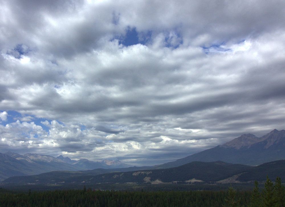 Dreigende wolkenlucht, in de omgeving van Maligne Lake, Canada.