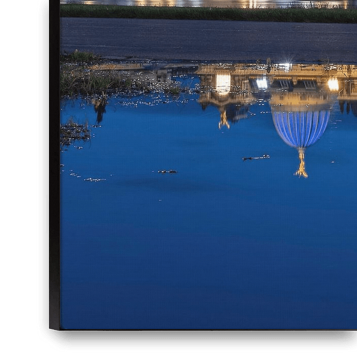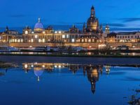 Nach dem Regen in Dresden spiegelten sich die Kuppeln der Frauenkirche und der Kunstakademie, von den Dresdnern liebevoll "Zitronenpresse" genannt, in einer großen Pfütze am Elbufer. Das Bild entstand in der Blauen Stunde am Abend, als bereits die Lichter die Stadtsilhouette dezent beleuchteten und eine stimmungsvolle Szenerie schafften.