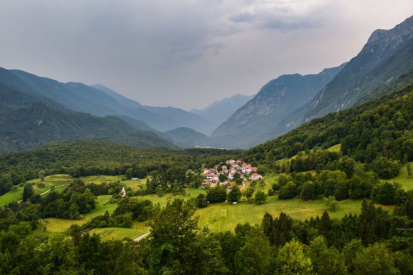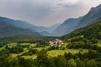 Ein Gewitter zieht über das Tal und das Dorf Drežnica in den Julischen Alpen im Westen Sloweniens hinweg.
