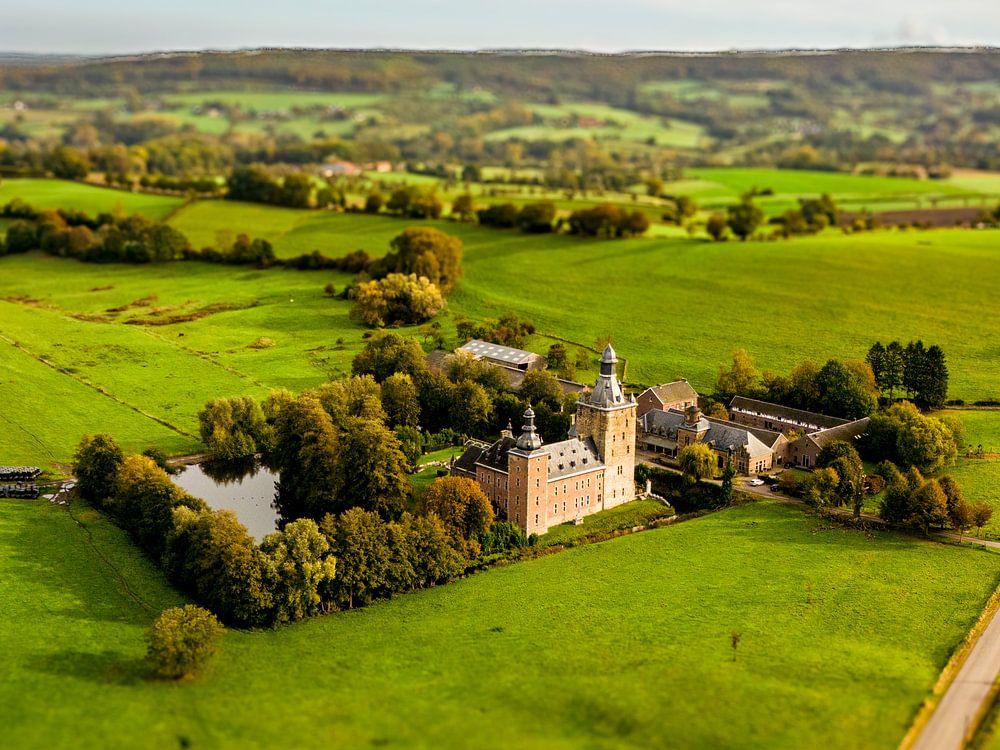 Eine Luftaufnahme von Schloss Beusdael an einem schönen Herbsttag im Oktober. Das Schloss Beusdael liegt gleich hinter der niederländisch-belgischen Grenze in Sippenaeken.