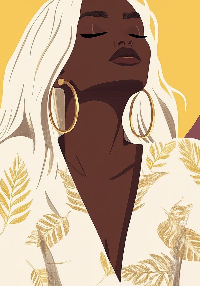Diese Illustration zeigt eine kraftvolle und kultivierte Frau mit einem tiefen, satten Teint, die selbstbewusst im Zentrum des Bildes steht. Ihr auffallend weißes Haar hebt sich deutlich von dem warmen rosa Hintergrund ab und vermittelt ein Gefühl von Gelassenheit und Geheimnis. Hinter ihrem Kopf befindet sich ein großer gelber Kreis, der sie als spirituellen oder magischen Brennpunkt in der Komposition platziert, fast so, als würde sie eine göttliche Präsenz ausstrahlen.