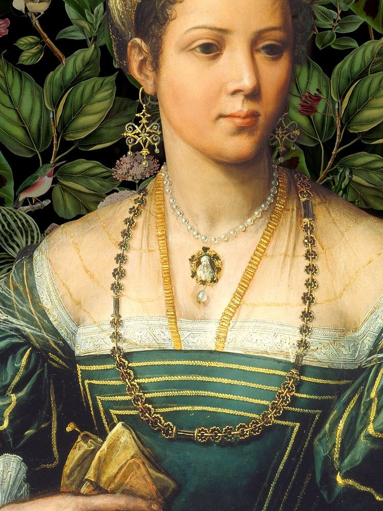 Ein schönes Porträt einer Renaissance-Dame in Grün. Reich verziert mit goldenen Nähten und Schmuckstücken.