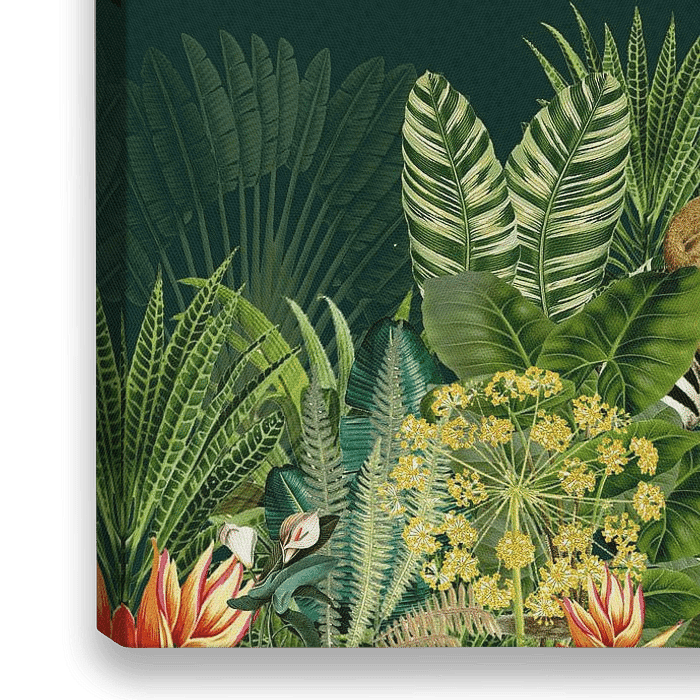 Bestelle diese Illustration Dschungel mit Giraffe, Zebra und Vögeln. von Studio POPPY als Reproduktion auf Leinwand, Alu-Dibond, als Poster, Fototapete oder Acrylglasbild.