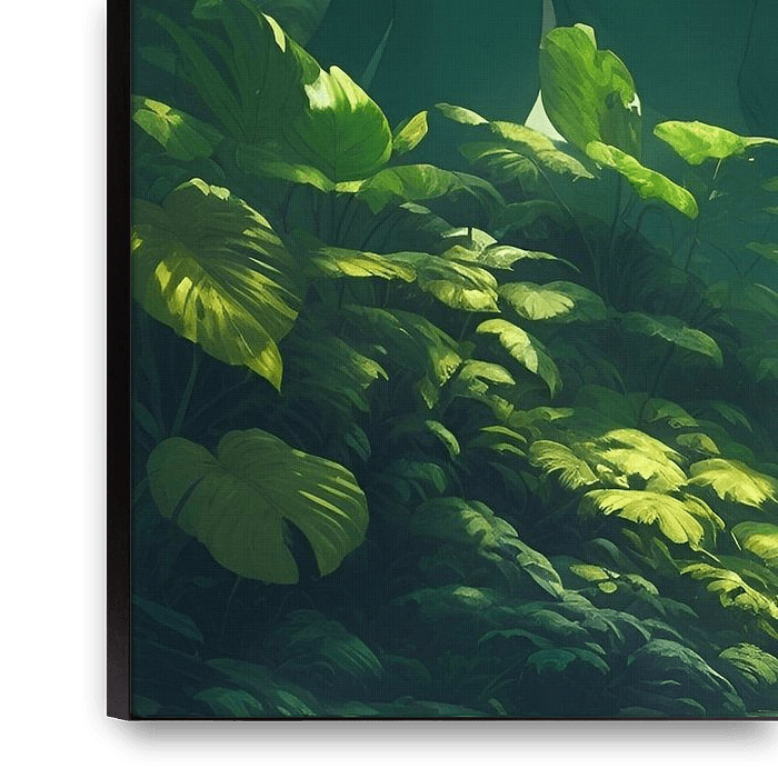 Tauchen Sie ein in die üppigen Tiefen dieses fesselnden Dschungelgemäldes. Lebendig und lebendig, explodiert die Leinwand mit einer Explosion von grünem Laub, das vor Leben wimmelt. Das Sonnenlicht dringt durch das dichte Blätterdach und wirft Schatten auf den Waldboden darunter. Jeder Pinselstrich fängt die wilde Energie und ungezähmte…