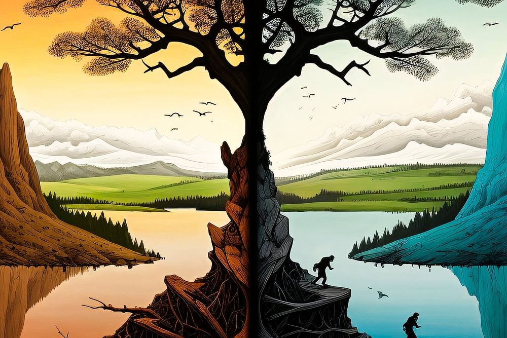 Dieses einzigartige Kunstwerk stellt eine Landschaft dar, die die Dualität von Tag und Nacht, Hitze und Kälte betont. Ein majestätischer Baum steht im Mittelpunkt, während die Farben der Natur mit ihren warmen Orangetönen und kühlen Blautönen Harmonie und Kontrast ausstrahlen. Das Kunstwerk eignet sich perfekt als Blickfang in modernen Innenräumen oder Büroumgebungen.