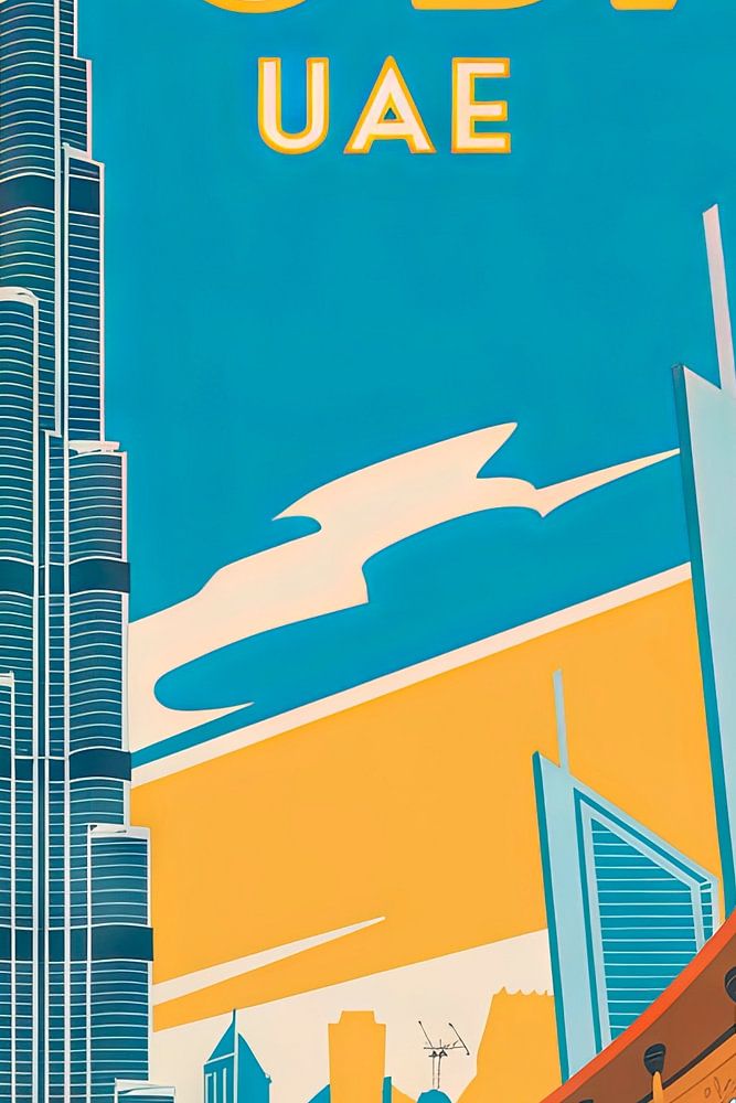Mit schimmernden, geometrischen Linien sticht das majestätische Bauwerk empor, das wie ein modernes Wunder der Ingenieurskunst wirkt. Umgeben von futuristischen Skyline-Motiven und strahlendem Himmel, verkörpert dieser Ort den Traum von Fortschritt und Luxus. Die warme Farbenpalette verspricht Abenteuer im Herzen der Wüste, wo Tradition auf Innovation trifft.