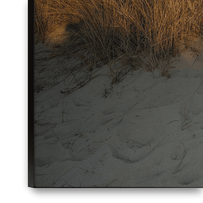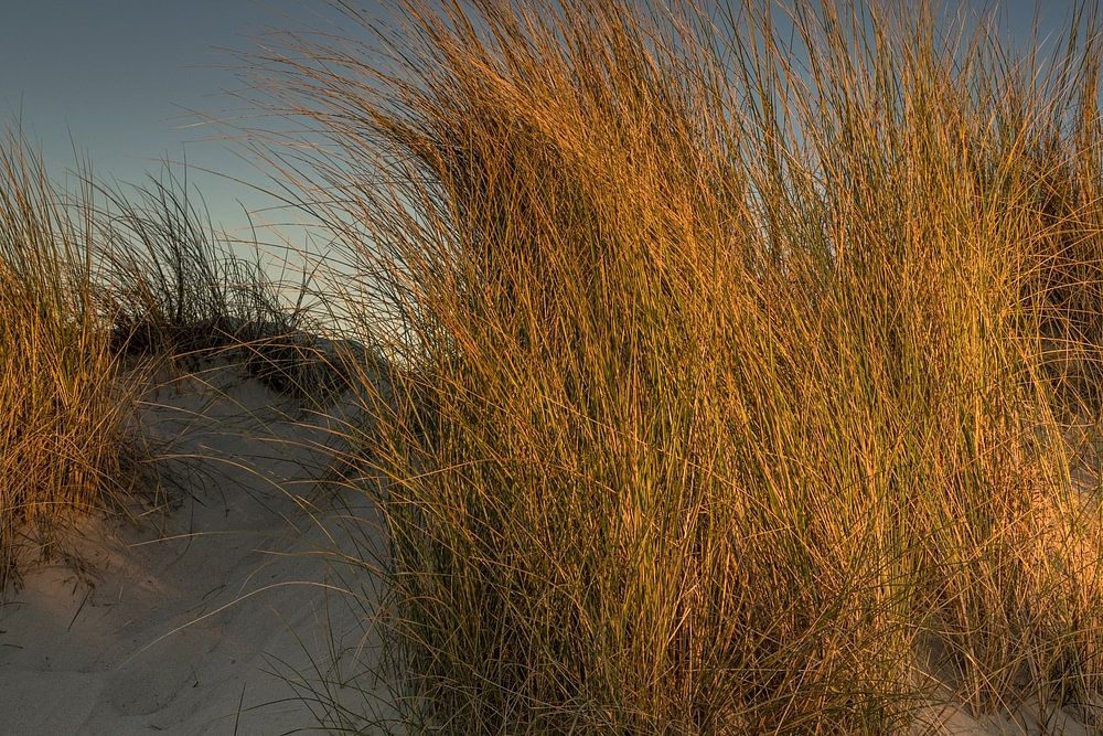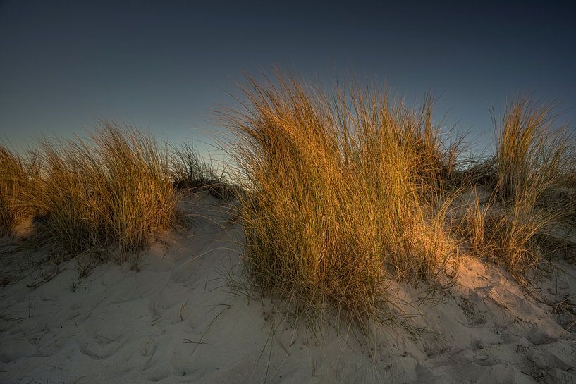 Die Landschaftsfotografie "Dünengras II" zeigt eine mit Gräsern bewachsene Sanddüne im Abendlicht unter einem dunkelblauen Himmel. Aufgenommen am Strand von Schillig an der Nordsee an einem sonnigen und klaren Abend im Winter 2025.