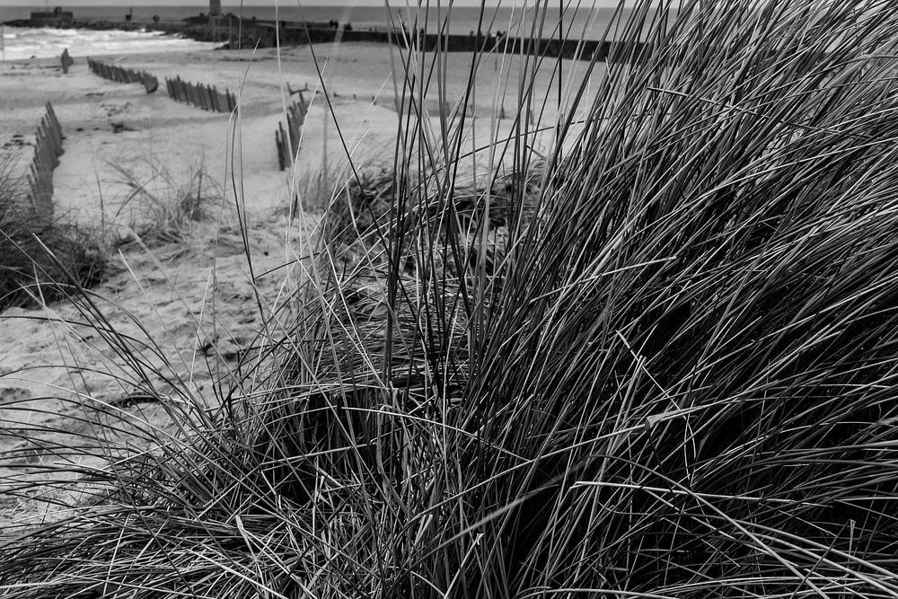 Hinter den Dünen und dem Dünengras in Warnemünde versteckt sich der weitläufige Strand und das Molenfeuer der Hafeneinfahrt .