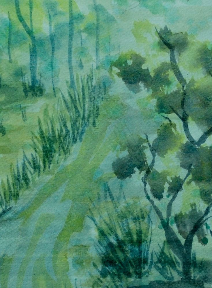 traditionelles Wasserfarben Gemälde einer düsteren wirkenden Waldlandschaft in grünen Wasserfarben.