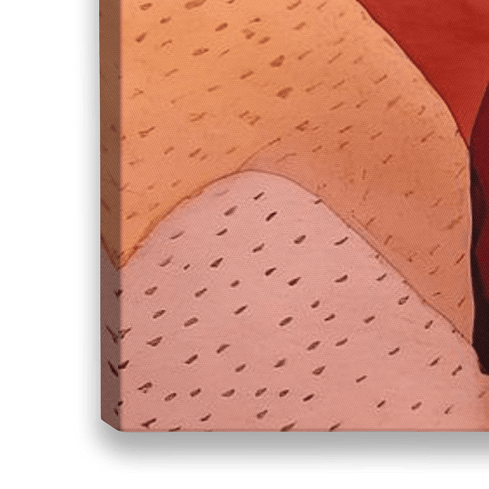 Die Formen erinnern an einen ruhigen, stillen Tanz von Blättern oder Flammen, mit einer dynamischen Energie, die von den tieferen, gesättigten Tönen im unteren Bereich zu den weicheren, helleren Tönen, die nach oben hin verblassen, ausgeht. Eine subtile Textur ist vorhanden, mit weichen Punkten, die an die zarten Spitzen eines feinen Stiftes erinnern und dem Stück eine zusätzliche Ebene von Details und Tiefe verleihen. Die Farbpalette reicht von warmen Pfirsich- und Rosatönen bis hin zu sattem Burgunderrot und gedämpften Grautönen und bildet eine harmonische Palette, die den Betrachter mit ihrer ruhigen Schönheit umarmt.