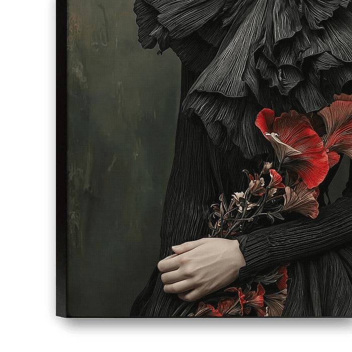 Ein faszinierendes Kunstwerk, in dem dramatische Kontraste zwischen feurigem Rot und tiefem Schwarz in einem surrealen Porträt verschmelzen. Eine üppige Komposition aus pilzartigen Formen in warmen Rottönen bildet einen spektakulären Kopfschmuck, während ein schwarzer Faltenkragen und ein schwarzes Faltenkleid eine theatralische Silhouette erzeugen. Die raffinierten Texturen und die Lichtführung schaffen eine geheimnisvolle, fast viktorianisch-gotische Atmosphäre, die klassische Eleganz mit moderner Dramatik verbindet.