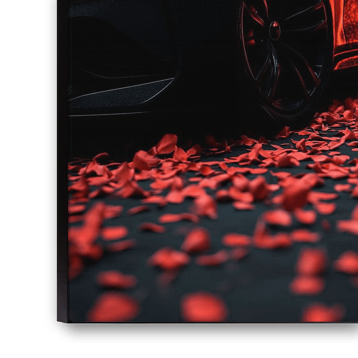 Eine künstlerische Aufnahme eines schwarzen BMW-Coupés, das auf einem Bett aus leuchtend roten Rosenblättern ruht, aus geringer Höhe. Ein warmes, feuriges Leuchten reflektiert die Karosserie des Autos und verbindet automobile Aggression mit intensiver, romantischer Dramatik.