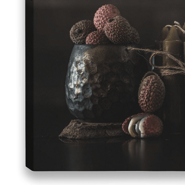 Dunkel und dunkel Stillleben Foto mit Obst und Kerzen. Eine schöne moderne visuelle Kunst-Zusammenstellung von Kerzen, Litschis, einem Zinnbecher und Holz.