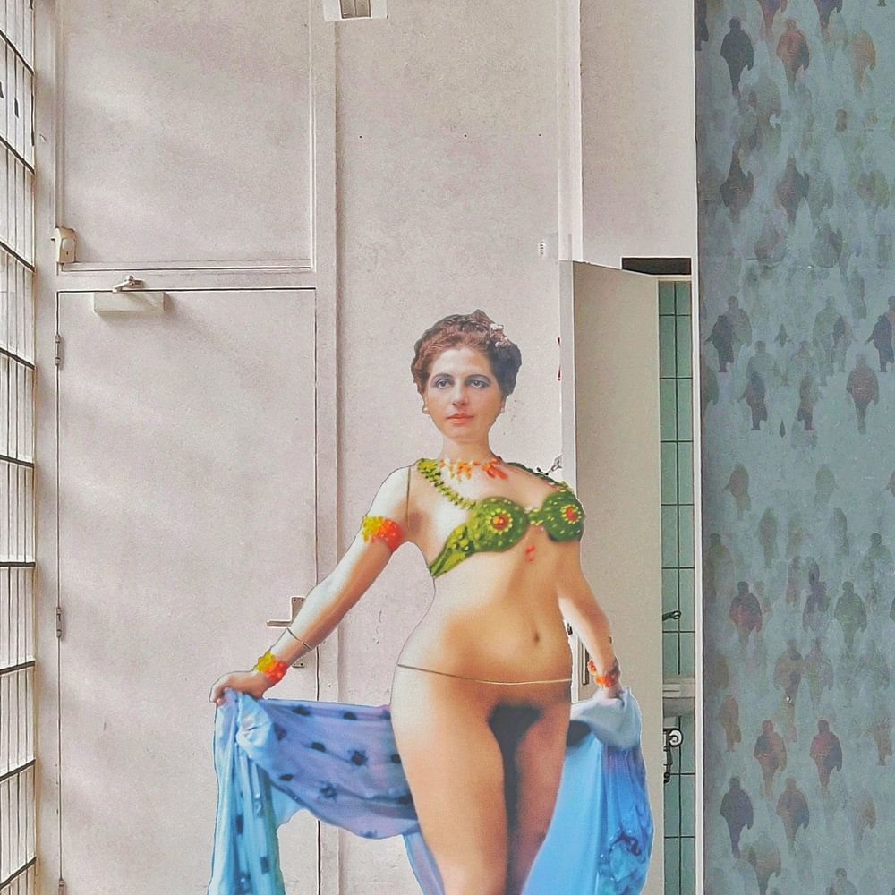 Stimmungsvolle Collage eines atmosphärisch beleuchteten leeren Ladenlokals, in dem Mata Hari ihren Auftritt hat. Sie trägt ein blaues Kleid und ist nur mit einem grünen BH und ihrem Schmuck bekleidet. Ich habe ihr auch Volumen gegeben und man kann auch sehen, dass sie halb Dame halb Schaufensterpuppe ist