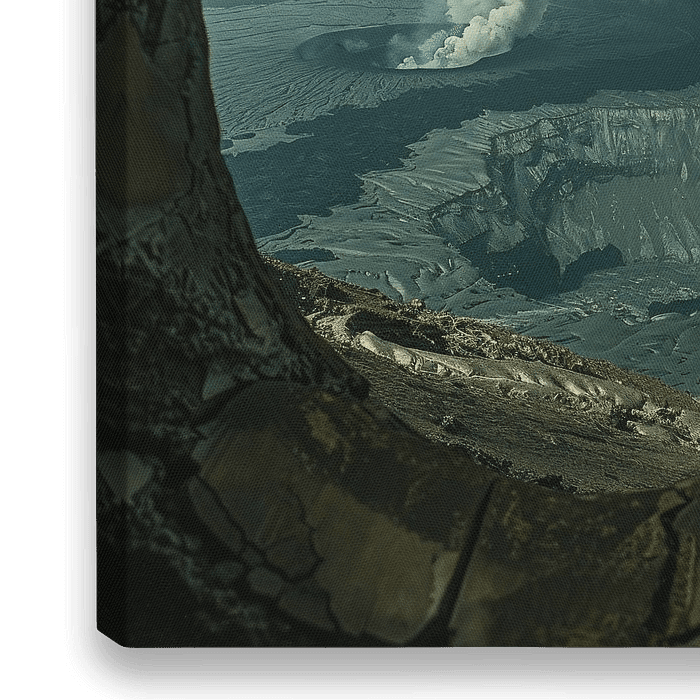 Dieses atemberaubende Kunstwerk fängt die rohe Kraft und majestätische Schönheit eines Vulkanausbruchs ein. Aus einer einzigartigen Perspektive, als würde man durch ein Zeitfenster blicken, sieht man die aus dem Krater aufsteigende Rauchfahne, umgeben von einer dramatischen Landschaft aus erstarrter Lava und schroffen Felsformationen.…
