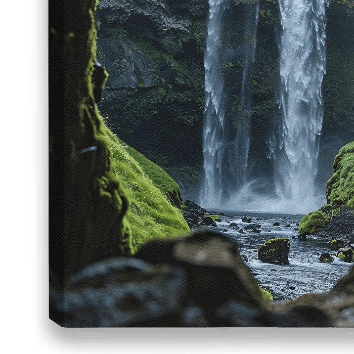 Entdecken Sie die verborgene Schönheit der Natur mit diesem atemberaubenden Foto. Ein majestätischer Wasserfall stürzt durch eine schmale Öffnung in einer Felswand, umgeben von üppigem grünen Moos und schroffen Felsformationen. Der Kontrast zwischen dem dunklen Felsen und dem klaren Wasser sorgt für einen dramatischen Effekt, während…