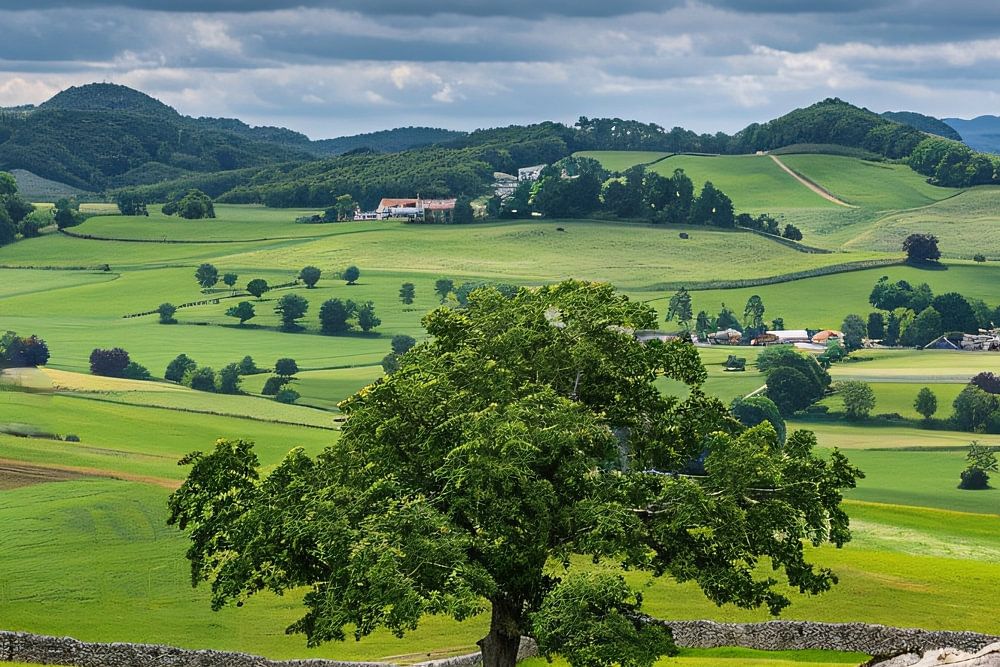Diese atemberaubende Landschaft, die durch ein steinernes Fenster aufgenommen wurde, bietet einen Blick auf zeitlose Schönheit. Sanfte Hügel, üppige Felder und ein stattlicher Baum bilden eine malerische Szene, die Ruhe und Gelassenheit ausstrahlt. Das weiche Licht und die satten Farben verleihen dem Bild eine träumerische Qualität und machen es zu einer perfekten Ergänzung für jeden Raum, der einen Hauch von natürlicher Eleganz braucht. Lassen Sie sich in diese friedliche Landschaft entführen und genießen Sie die einfache Pracht der Natur.