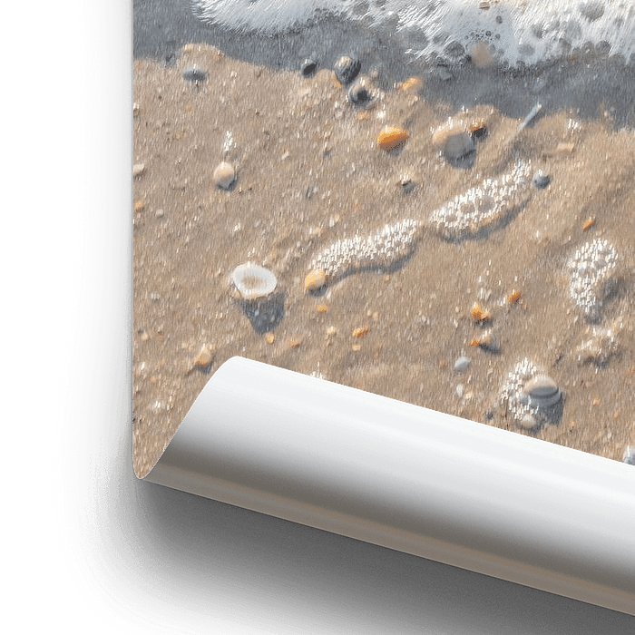 Tauchen Sie mit diesem atemberaubenden Kunstdruck in die heitere Welt eines ruhigen Strandes ein. Dieses Bild ist perfekt für Naturliebhaber und Ruhesuchende. Es fängt das beruhigende Zusammenspiel von Sand und Wasser ein, komplett mit winzigen Muscheln und Kieselsteinen, die die Küstenlinie schmücken.