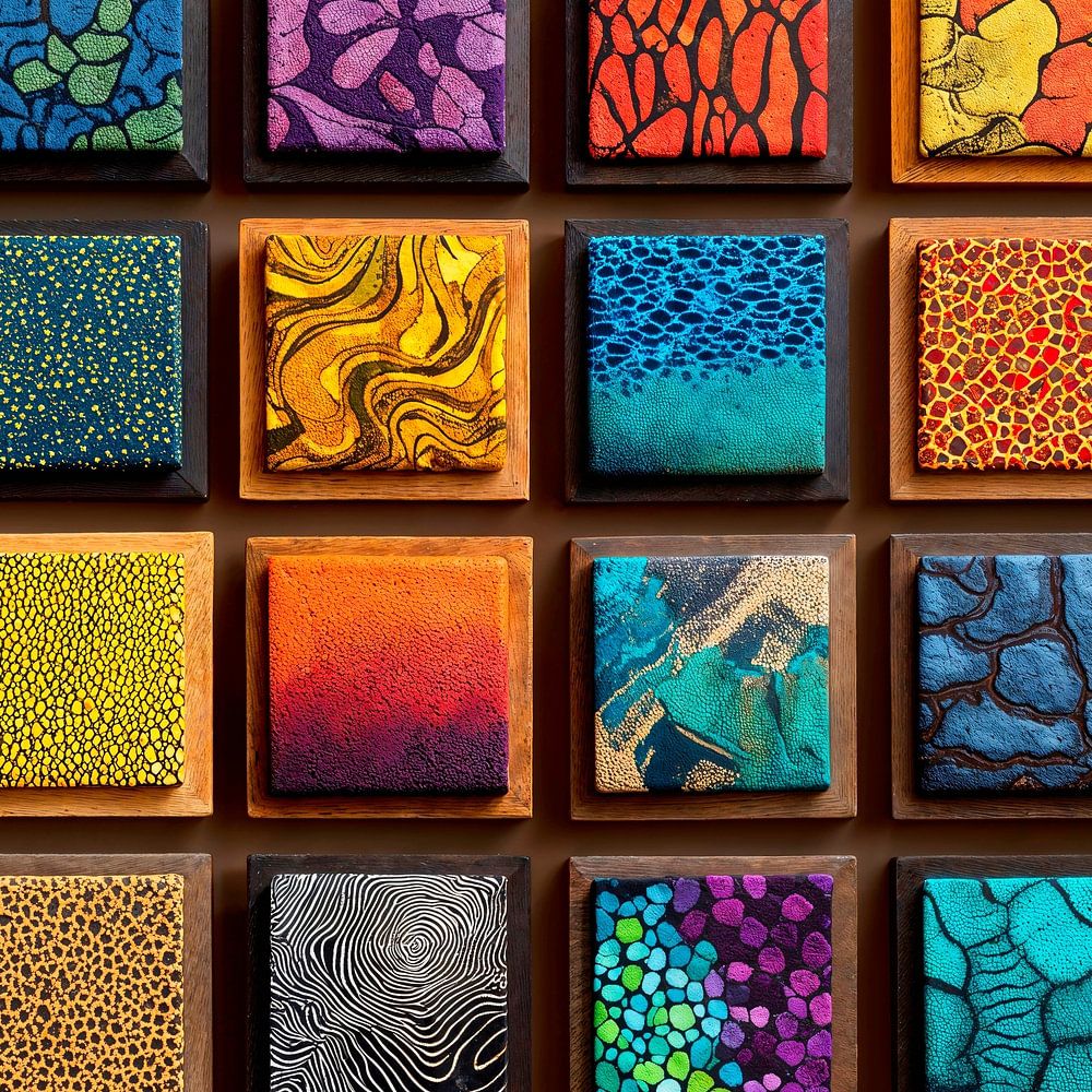 Ein abstraktes Kunstwerk, das aus einer Sammlung kleiner, gerahmter quadratischer Gemälde besteht. Jede Leinwand zeigt eine einzigartige abstrakte Komposition mit einer Vielfalt an Farben, Texturen und Pinselstrichen. Der Gesamteindruck ist ein lebendiges und dynamisches Mosaik abstrakter Kunst. Die Sammlung von Leinwänden bildet ein…