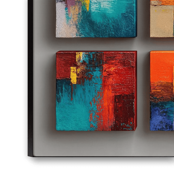 Ein Kunstwerk aus neun abstrakten Gemälden, jedes mit einer Mischung aus leuchtenden Farben und geometrischen Formen. Jedes Kunstwerk hat eine strukturierte Oberfläche, die Tiefe und visuelles Interesse erzeugt, die Anordnung ist modern und dynamisch.