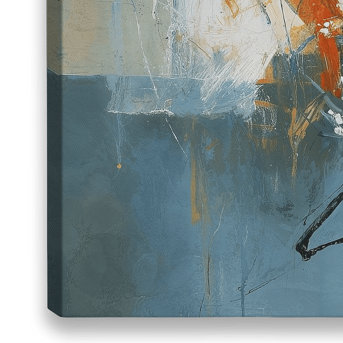 Dynamischer Kontrast | Abstrakter Expressionismus - Dieses abstrakte Kunstwerk kombiniert eine harmonische Farbpalette aus warmen Gelbtönen, ruhigen Blautönen und dynamischen Rottönen mit lockeren, fließenden Pinselstrichen und energischen Spritztechniken. Der Stil spielt mit Raum und Bewegung, wobei verschiedene Schichten und Texturen…