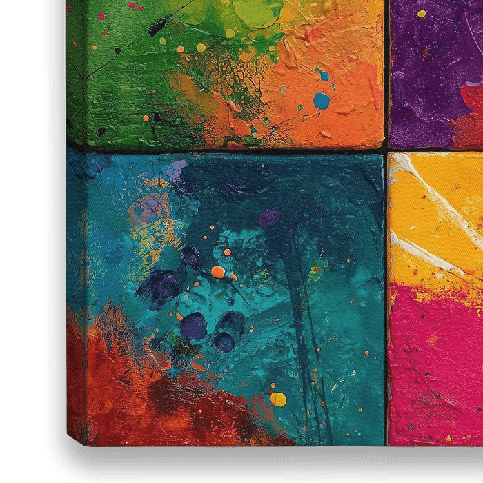 Ein lebhaftes, abstraktes Kunstwerk, das aus einer Komposition von neun quadratischen Tafeln besteht, von denen jede mit auffälligen Tropfen und Spritzern versehen ist, wodurch eine dynamische und energiegeladene Komposition entsteht.