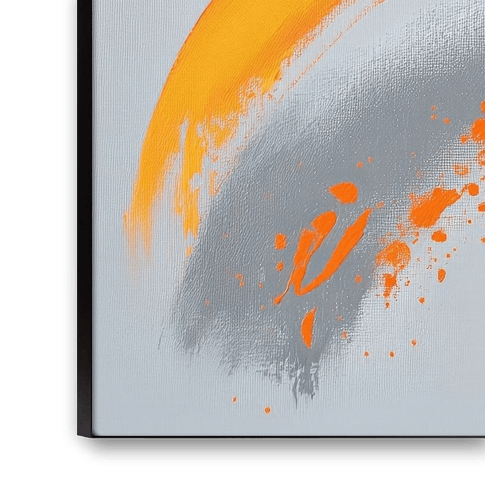 Ein lebendiger orangener Bogen schwingt dynamisch über die Leinwand und entfaltet ein Gefühl von Energie und Wärme. Die sanften Übergänge und spritzigen Farbtupfer verleihen der Komposition Lebhaftigkeit und Freude. Perfekt für eine Küche oder ein Wohnzimmer, sorgt dieses Kunstwerk für ein einladendes und kreatives Ambiente.