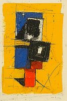 Dieses auffällige Kunstwerk ist eine visuelle Augenweide, bestehend aus einer dynamischen Mischung von Primärfarben vor einem leuchtend gelben Hintergrund. Die Komposition besteht aus geometrischen Formen und Linien, die sich ineinander verschlingen und zu tanzen scheinen und ein tiefes Gefühl von Bewegung und Energie ausstrahlen. Die…