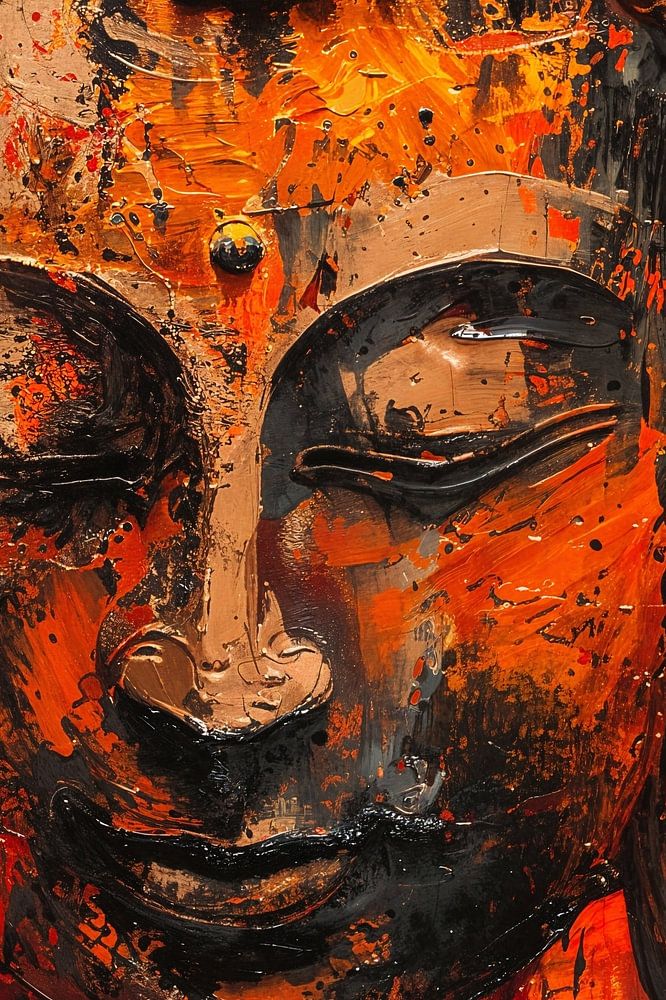 Dieses lebendige Kunstwerk zeigt ein abstraktes Porträt von Buddha, das in einer Explosion leuchtender Farben ausgeführt ist. Die tiefen Orange- und Rottöne mischen sich mit gelben, schwarzen und braunen Akzenten und schaffen ein dynamisches und emotionales Bild. Dieses Gemälde wäre eine eindrucksvolle Ergänzung für jedes moderne Interieur, vom Wohnzimmer bis zum Büro. Die Verwendung von dicken Farbschichten und rauen Strukturen verleiht dem Kunstwerk eine greifbare Tiefe, so dass es fast von der Leinwand zu kommen scheint.