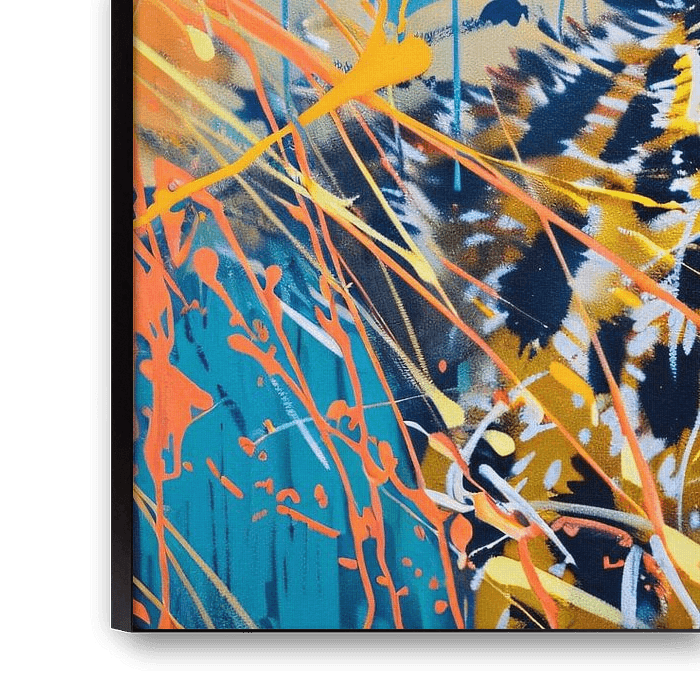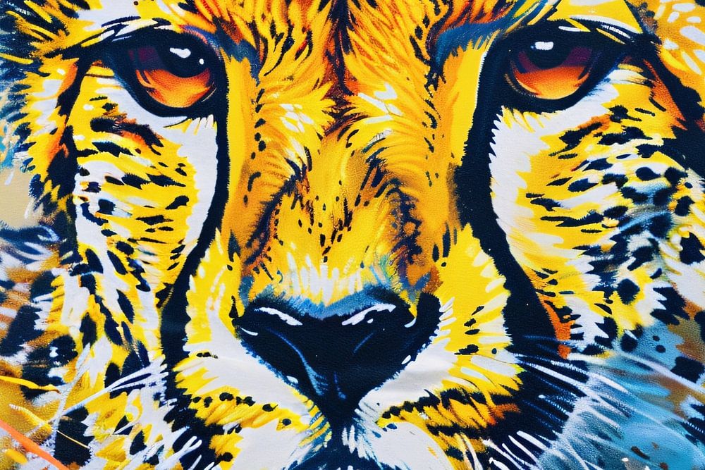 Dieses dynamische Gemälde eines Geparden ist ein atemberaubendes Beispiel für moderne Kunst. Mit einer Explosion von Farben und einem lebendigen Look bringt das Design Energie und Lebendigkeit in jeden Raum. Die Verwendung von Gelb, Orange, Blau und die Kontraste in Schwarz und Weiß machen dieses Kunstwerk zu einem auffälligen und einzigartigen Werk. Dieses Gemälde eignet sich perfekt für ein Schlafzimmer oder ein Esszimmer und bringt einen Hauch von wilder Natur und abstrakter Schönheit in Ihr Interieur. Egal, ob Sie ein Kunstliebhaber sind oder einfach nur etwas Besonderes suchen, um Ihre Wände zu dekorieren, dieses Gepardenbild ist eine ausgezeichnete Wahl.