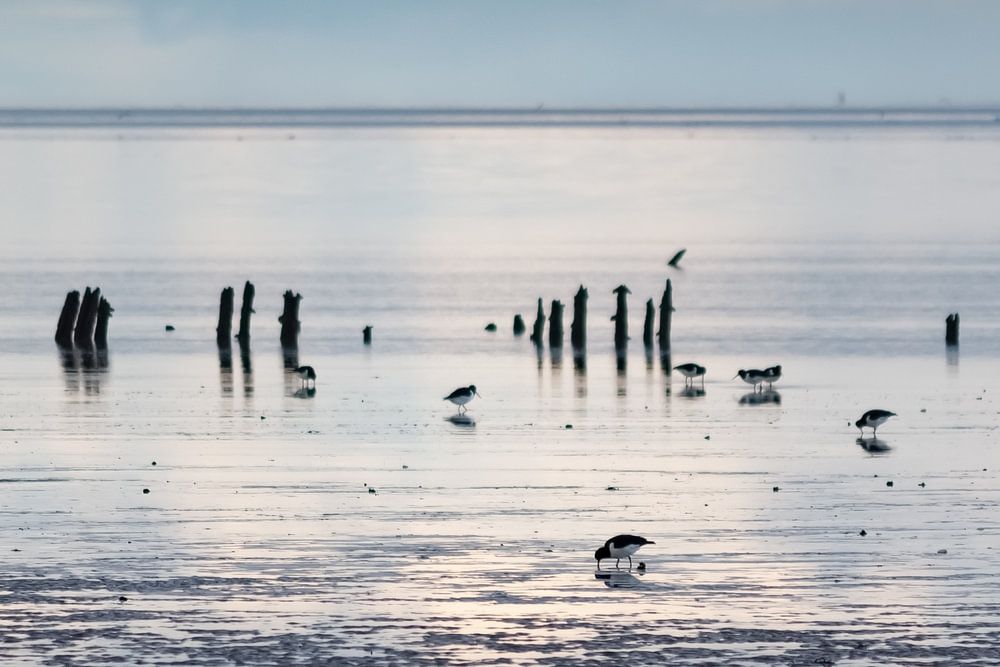 Austernfischer, die bei Ebbe auf dem Wattenmeer nach Nahrung suchen