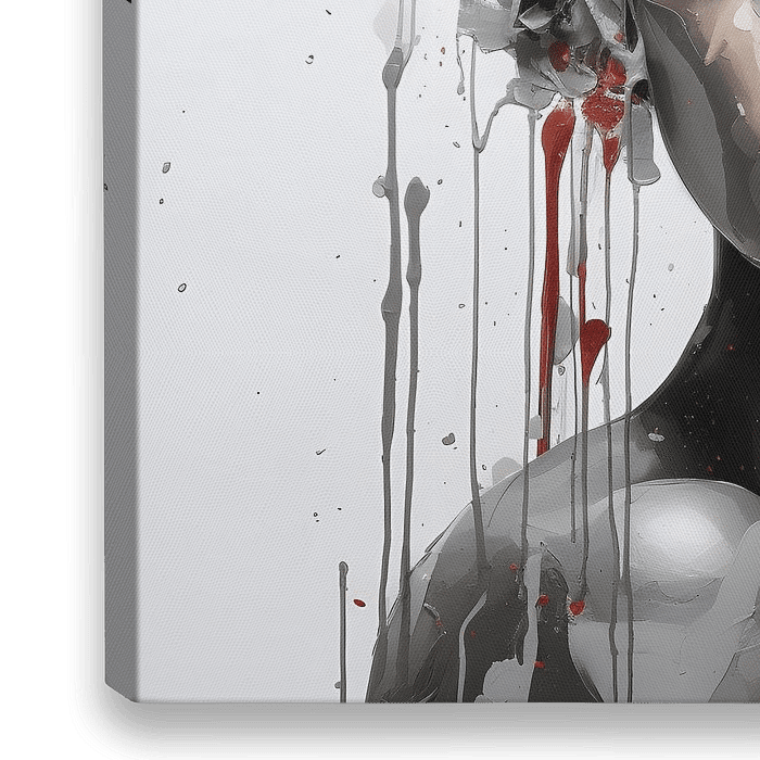 Dieses auffällige Werk kombiniert scharfe Kontraste und lebendige Bilder und zeigt eine Figur, die mit einem Turban aus fließenden Grautönen und kühnen roten Blumenspritzern gekrönt ist. Das Rot tropft wie Blut oder Farbe, ein Symbol für Vitalität und Unbeständigkeit zugleich. Ihr Ausdruck ist gedämpft und eindringlich, eine stille…