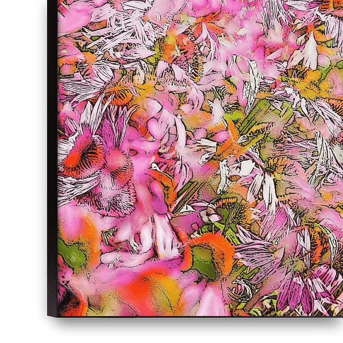 Ein fröhliches, sommerliches Werk in hauptsächlich lila und weißen Tönen, basierend auf einer Fotografie eines Feldes von Echinacea purpurea, einer Pflanze, auch als Roter Scheinsonnenhut die für ihre medizinischen Eigenschaften bekannt ist.