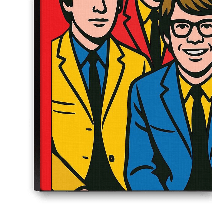 Der rote Hintergrund wirkt wie ein leuchtender Horizont, eine Leinwand aus reiner Energie, auf der die Musiker leuchten. Die Wiederholung der Primärfarben symbolisiert die Einfachheit, aber auch die unerschöpfliche Kraft der Wiederholung in der Musik: Refrains, die sich in unser Gedächtnis einbrennen, Akkorde, die nie alt zu werden scheinen.