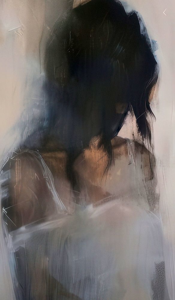 Verblasstes Ölgemälde einer schönen Frau mit dunklem Haar in einem weißen Kleid. Elegant, raffiniert und geheimnisvoll. Erdtöne in Beige, Sand, Grau, Braun, Schwarz und Weiß. Verborgen. Lässt neugierig werden, was diese Frau beschäftigt, wer ist sie? Passt zu verschiedenen Stilen und Trends wie Modern Abstract, Romantic, Natural, Modern Country, Rural, Sober. Künstlerin: Bianca ter Riet