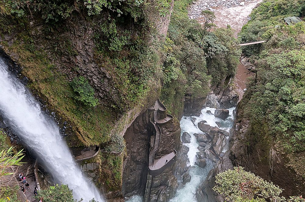 Pailón Diablo watervalDeze waterval is de meest bezochte waterval in Ecuador. Op een indrukwekkende 265 voet of 80 meter schudt deze waterige duik van miljoenen kubieke voet per seconde echt de aarde. De Pailón of "Big Cauldron" - gedeelte van de naam beschrijft de dikke darm bij de basis van de waterval, terwijl de Diablo of "duivels" - deel is afgeleid van turbulente speling en totale chaos die de duivels op de rotsen hierboven lijken te veroorzaken in de gewelddadige brouwen.